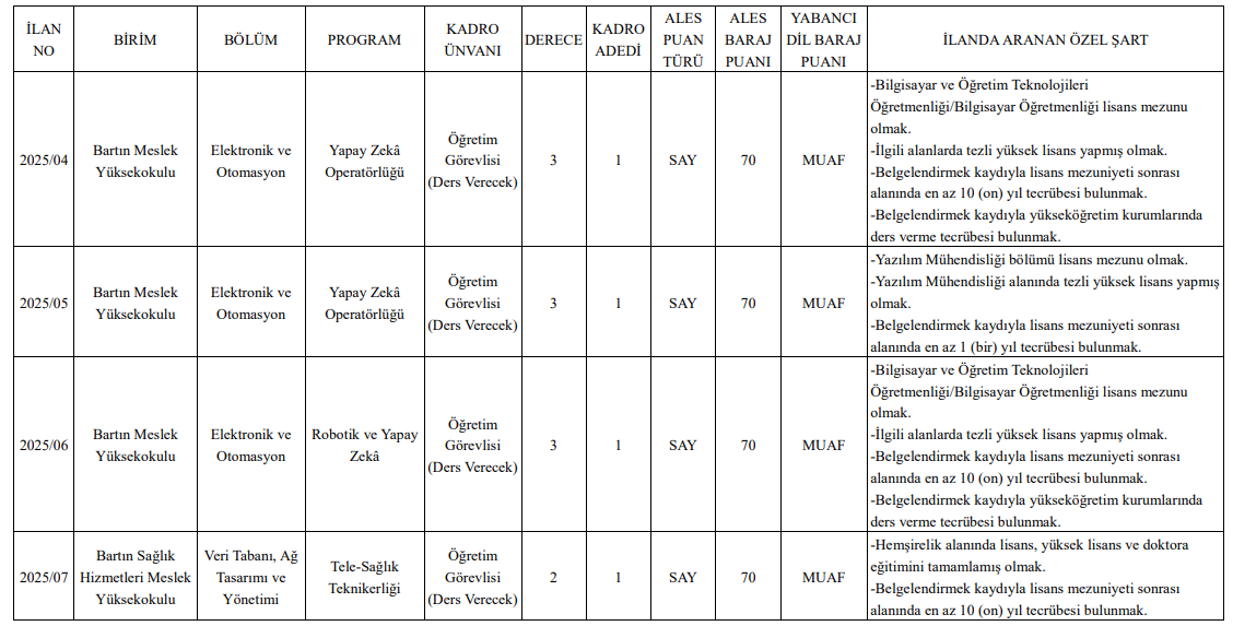 Bartın Üniversitesi, adayların 657 sayılı Devlet Memurları Kanunu’nun 48. maddesinde belirtilen şartları taşımasını, ALES’ten en az 70 puan almasını ve gerekli lisans-yüksek lisans veya tezli yüksek lisans derecesine sahip olmasını şart koşuyor. Merkezi sınav muafiyetinden yararlanmak isteyen adaylar, başvuru belgeleriyle muafiyetlerini kanıtlayabilir ve ALES puanı 70 olarak kabul edilir.