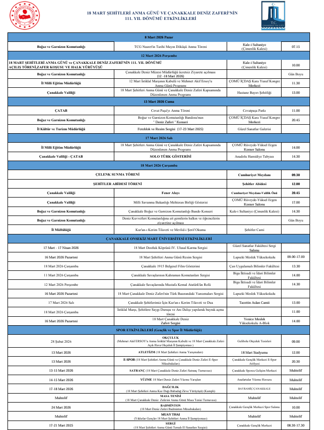 Çanakkale Valiliği koordinasyonunda düzenlenecek programlarda şehitler anılacak, tarihi zaferin hatırası çeşitli etkinliklerle yaşatılacak. 12–18 Mart tarihleri arasında yoğun bir programla gerçekleşecek etkinlikler kapsamında askeri törenler, anma programları, kültürel faaliyetler ve spor organizasyonları düzenlenecek.