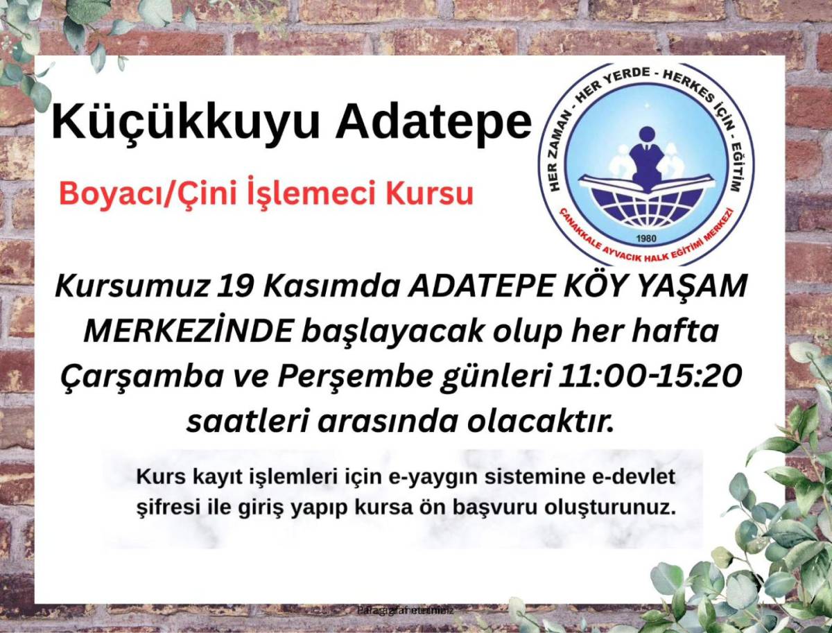Çanakkale Ayvacık Halk Eğitim Merkezi, el sanatlarına ilgi duyan vatandaşlar için yeni bir fırsat sunuyor. 19 Kasım 2025’te başlayacak Boyacı/Çini İşlemeci Kursu, her hafta Çarşamba ve Perşembe günleri 11:00-15:20 saatleri arasında Adatepe Köy Yaşam Merkezi’nde gerçekleştirilecek. Kurs, hem geleneksel çini işleme tekniklerini öğrenmek isteyenler hem de bu alanda profesyonel beceriler kazanmayı hedefleyenler için ideal bir ortam sunuyor.