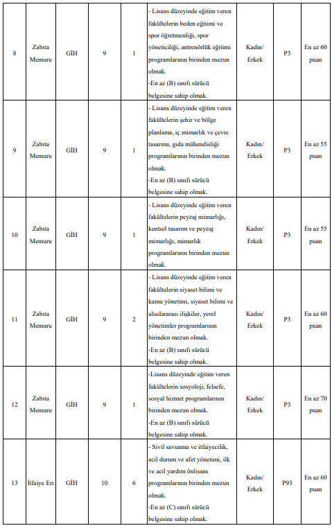 Zabıta memuru ve itfaiye eri kadrolarında başvurular için ek kriterler bulunuyor. Buna göre: