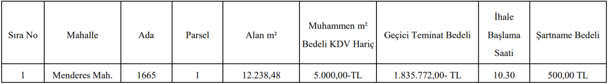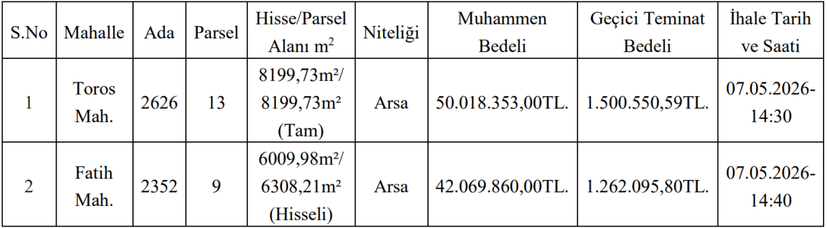 Toros Mahallesi’nde bulunan 8.199 metrekarelik arsa için belirlenen muhammen bedel 50 milyon 18 bin TL olarak açıklandı. Geçici teminat bedeli ise 1 milyon 500 bin TL’yi aşıyor.