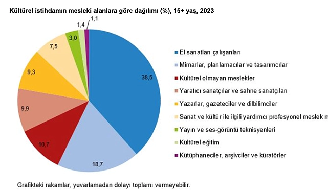 Kültürel istihdam, 2023 yılında bir önceki yıla göre %9,0 artarak 743 bin kişiye ulaştı. Bu çalışanların %60,8’i 30-54 yaş grubunda yer alırken, %38,5’i el sanatları çalışanlarından oluştu.