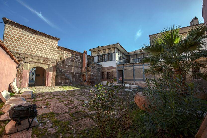 Yapı, mahremiyeti koruyan yüksek duvarlarla çevrili bir avluya sahiptir. Avluya kemerli bir giriş kapısından ulaşılmaktadır. Avlu içerisinde, Skepsis Antik Kenti’nden getirilen mimari parçalar ile çeşitli etnografik eserler sergilenmektedir. Güneydoğu köşede ise dışa eklenmiş küçük bir hamam kalıntısı yer almaktadır.