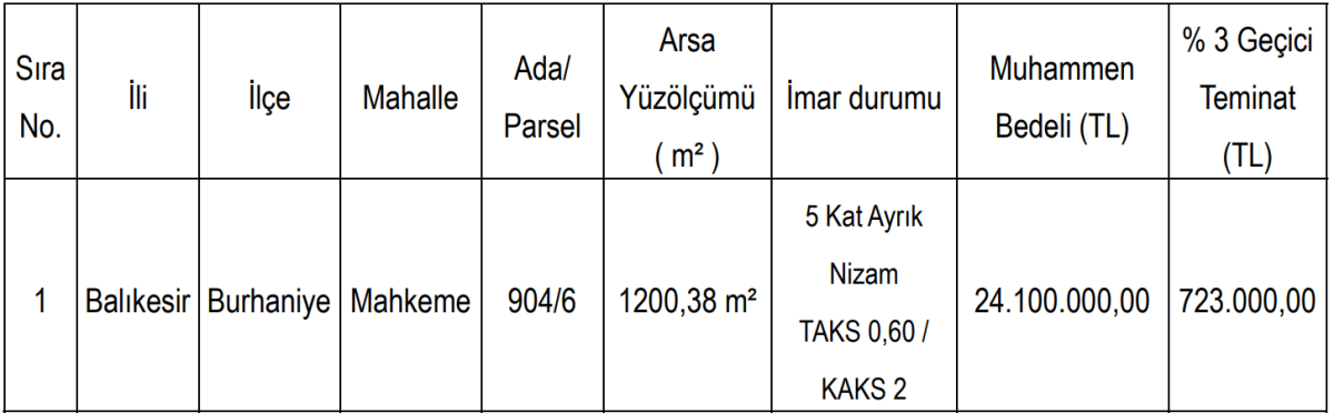 İhale kapsamında satışa sunulan taşınmaz, Balıkesir İli Burhaniye İlçesi Mahkeme Mahallesi sınırları içerisinde yer alıyor. İşte arsanın öne çıkan özellikleri: