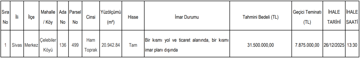 Satışa çıkarılan taşınmaz, Sivas ili Merkez ilçesi Çelebiler Köyü sınırları içerisinde yer alıyor. Tapu kayıtlarına göre taşınmaz 136 ada 499 parsel numarasıyla kayıtlı bulunuyor. “Ham toprak” niteliğindeki taşınmazın toplam yüzölçümü 20.942,84 metrekare olarak açıklandı. Taşınmazın tamamı satışa sunulacak olup hisse durumu “tam” olarak belirtildi.