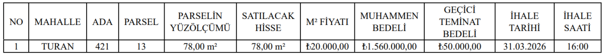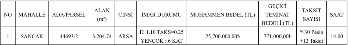 Satış şartlarına göre taşınmaz için yüzde 30 peşinat ödenecek, kalan tutar ise 12 taksit halinde ödenebilecek.