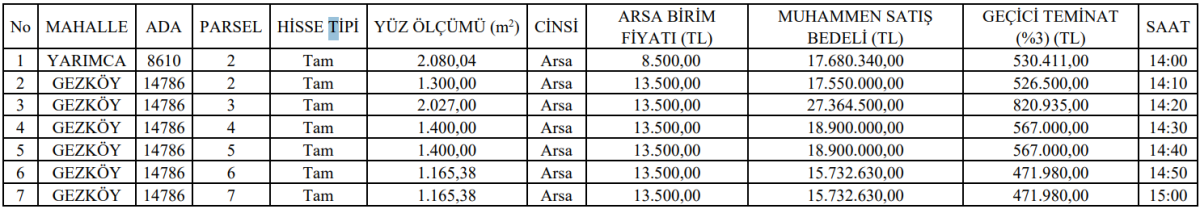 Gezköy Mahallesi’nde bulunan diğer arsaların muhammen bedelleri ise yaklaşık 15 milyon TL ile 27 milyon TL arasında değişiyor.
