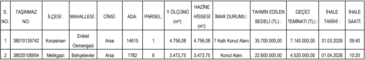 Bu taşınmazların ihalesi 31 Mart ve 1 Nisan 2026 tarihlerinde Kayseri’de gerçekleştirilecek.