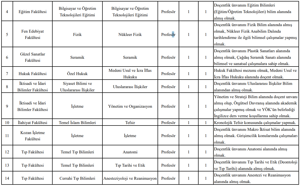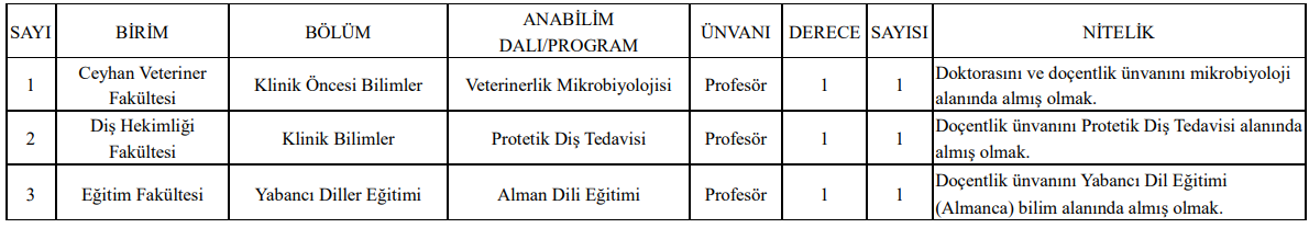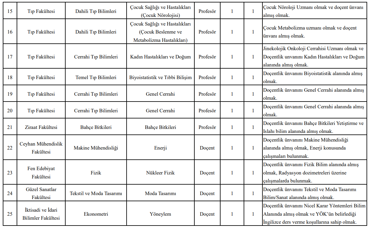 Çukurova Üniversitesi tarafından yayımlanan ilana göre profesör kadrosu açılan bazı birimler şu şekilde: