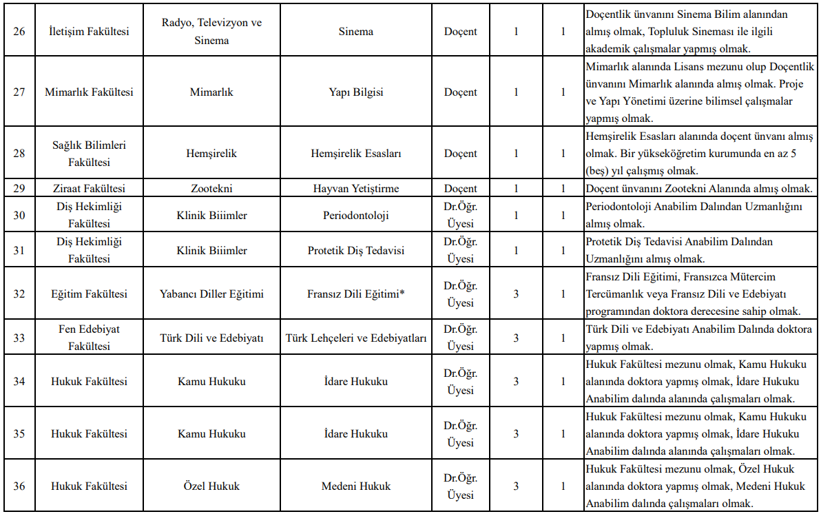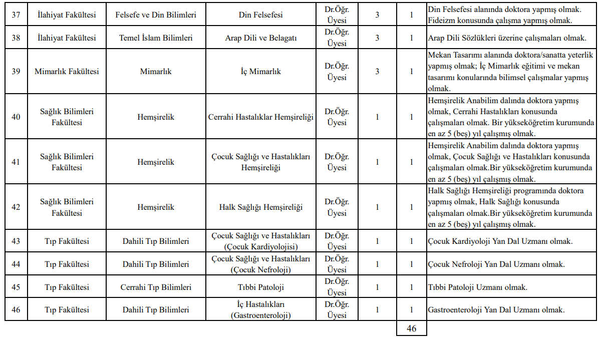 Doktor Öğretim Üyesi kadroları; Diş Hekimliği, Eğitim, Fen Edebiyat, Hukuk, İlahiyat, Mimarlık, Sağlık Bilimleri ve Tıp Fakültelerinde yoğunlaşıyor. Çocuk kardiyolojisi, gastroenteroloji, patoloji, periodontoloji, Fransız Dili Eğitimi, Türk Lehçeleri, Din Felsefesi ve İç Mimarlık gibi alanlar dikkat çekiyor.