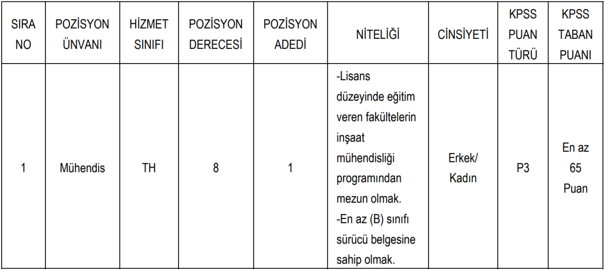 İlan edilen pozisyon için başvuracak adayların İnşaat Mühendisliği bölümünden mezun olması gerekiyor. Bunun yanı sıra adaylardan en az B sınıfı sürücü belgesine sahip olmaları da isteniyor.