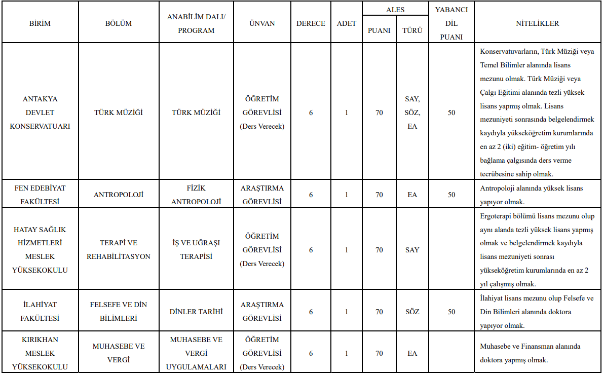 Hatay Mustafa Kemal Üniversitesi’nin yayımladığı ilana göre alım yapılacak bazı birimler şöyle: