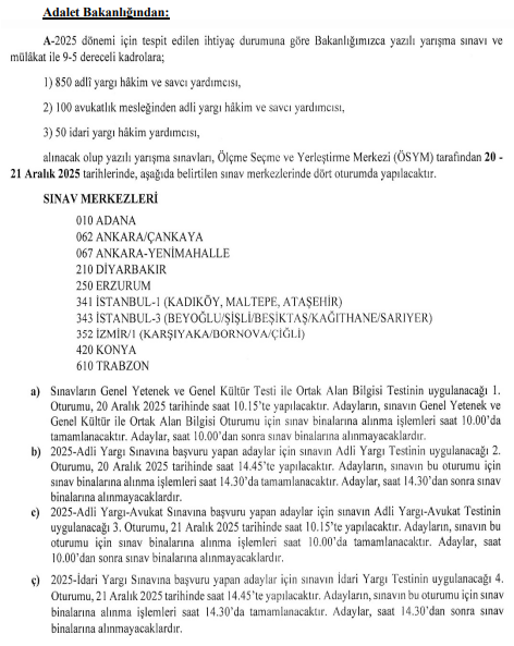 Adalet Bakanlığı, 2025 yılı için büyük bir personel alımına hazırlanıyor. Bakanlık tarafından yapılan duyuruya göre, 850 adlî yargı hâkim ve savcı yardımcısı, 100 avukatlık mesleğinden adlî yargı hâkim ve savcı yardımcısı ve 50 idari yargı hâkim yardımcısı alınacak.