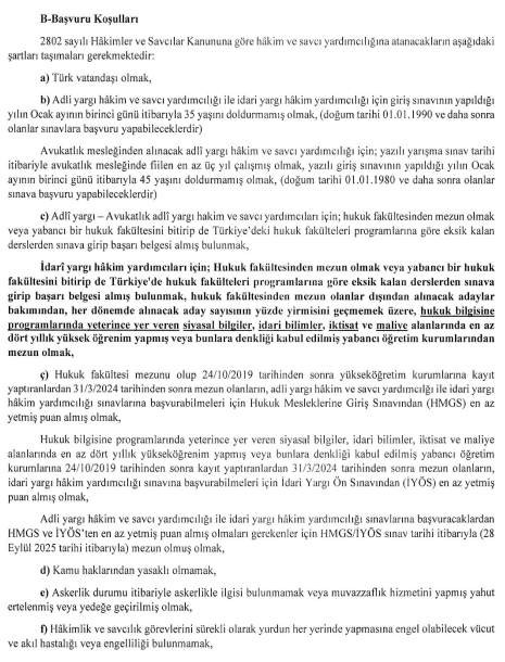 Başvurular, 2802 sayılı Hâkimler ve Savcılar Kanunu kapsamında yapılacak olup, adayların aşağıdaki koşulları taşıması gerekiyor: