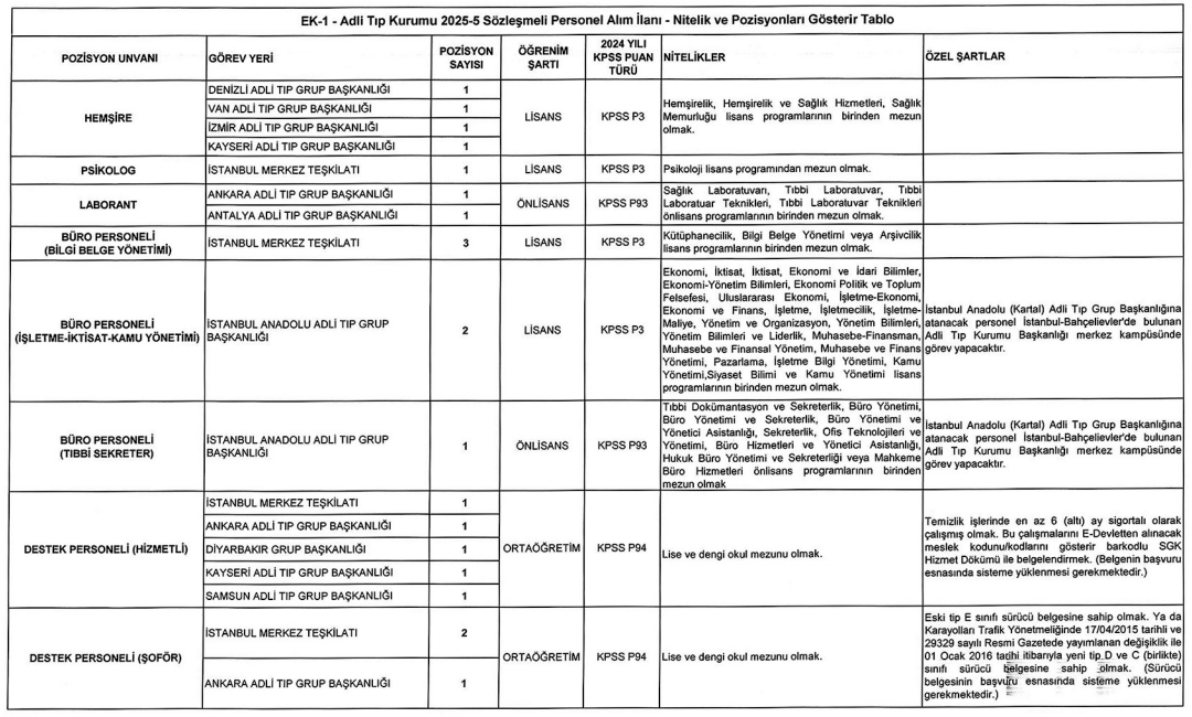 Adalet Bakanlığına bağlı Adli Tıp Kurumu Başkanlığı, merkez ve taşra teşkilatlarında görevlendirilmek üzere sözleşmeli personel alımı yapacağını duyurdu. Resmî ilana göre alımlar, 657 sayılı Devlet Memurları Kanunu’nun 4/B maddesi kapsamında ve Sözleşmeli Personel Çalıştırılmasına İlişkin Esaslar doğrultusunda gerçekleştirilecek.