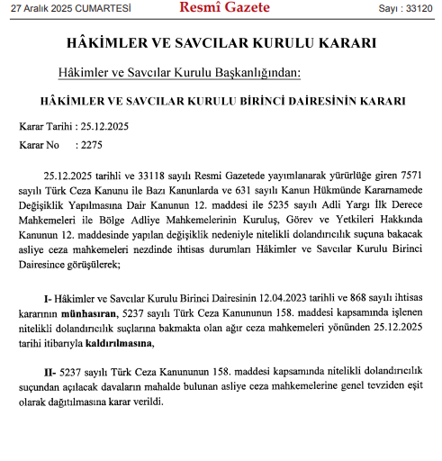 Hâkimler ve Savcılar Kurulu (HSK) Birinci Dairesi tarafından alınan karar, 27 Aralık 2025 tarihli ve 33120 sayılı Resmî Gazete’de yayımlanarak yürürlüğe girdi. 25 Aralık 2025 tarihli ve 2275 sayılı karar ile nitelikli dolandırıcılık suçlarına bakacak mahkemelerin görev dağılımında önemli bir değişikliğe gidildi.