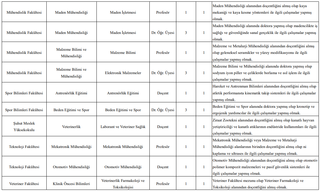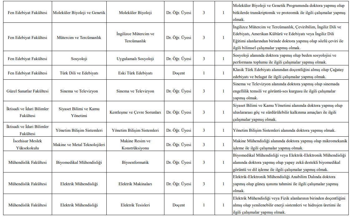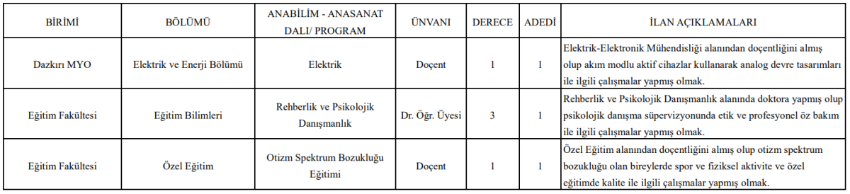Diğer ilanlar arasında özel eğitimde otizm spektrum bozukluğu, biyomedikal görüntü işleme, elektrik tesisleri, sinema ve televizyon çalışmaları gibi çeşitli alanlar yer alıyor. Her kadro için adayların belirlenen uzmanlık ve araştırma alanlarında bilimsel çalışmaları bulunması gerekiyor.