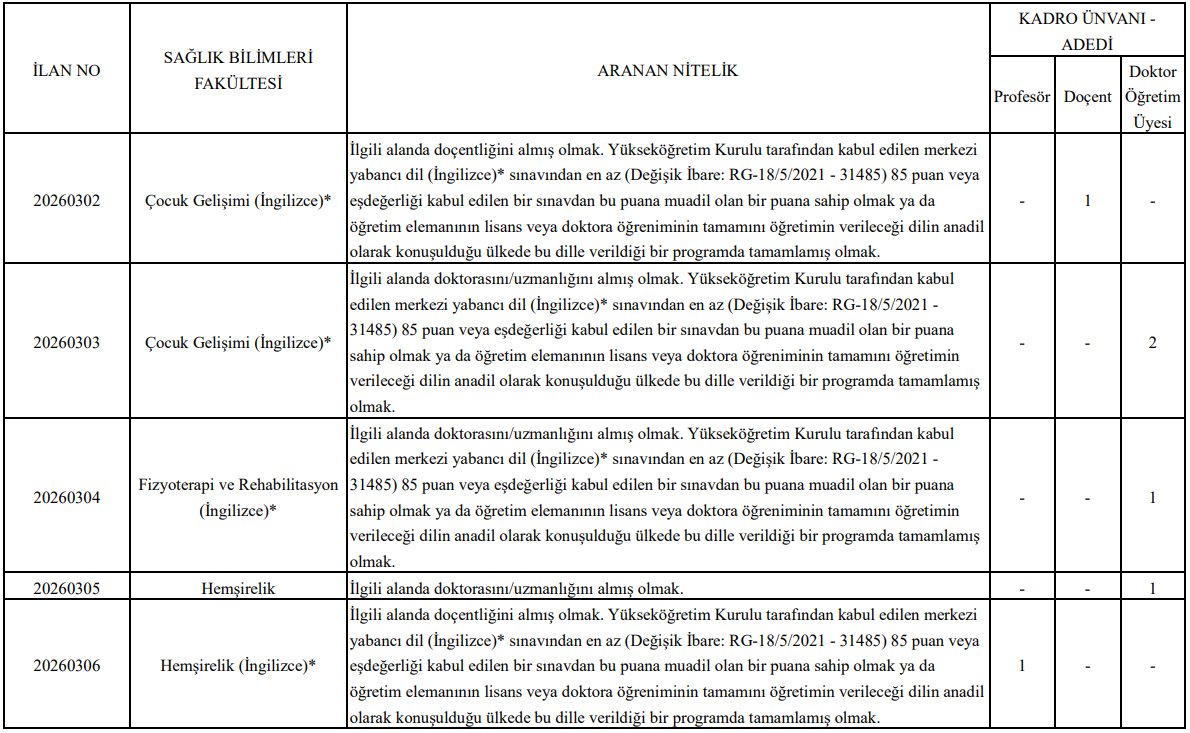Profesör ve Doçent Kadroları: Çocuk Gelişimi ve Hemşirelik alanlarında doçentlik veya doktora yapmış olmak; İngilizce sınavından minimum 85 puan veya öğretim dilini anadil olarak konuşulan ülkede öğrenim görmüş olmak.