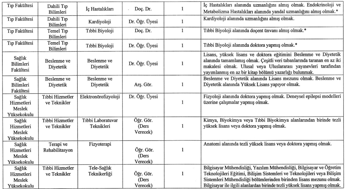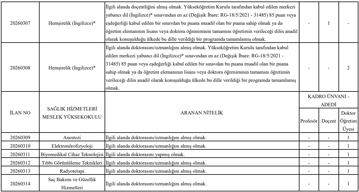 Doktor Öğretim Üyesi Kadroları: Çocuk Gelişimi, Fizyoterapi ve Rehabilitasyon, Hemşirelik, Anestezi, Elektronörofizyoloji, Biyomedikal Cihaz Teknolojisi, Tıbbi Görüntüleme Teknikleri, Radyoterapi, Saç Bakımı ve Güzellik Hizmetleri alanlarında doktora veya uzmanlık derecesine sahip olmak yeterli.