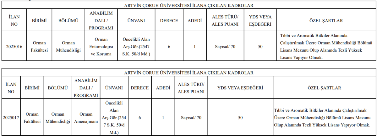 Artvin Çoruh Üniversitesi Orman Fakültesi bünyesinde iki ayrı araştırma görevlisi kadrosu ilan edildi. Kadrolar, öncelikli alan kapsamında açıldı.