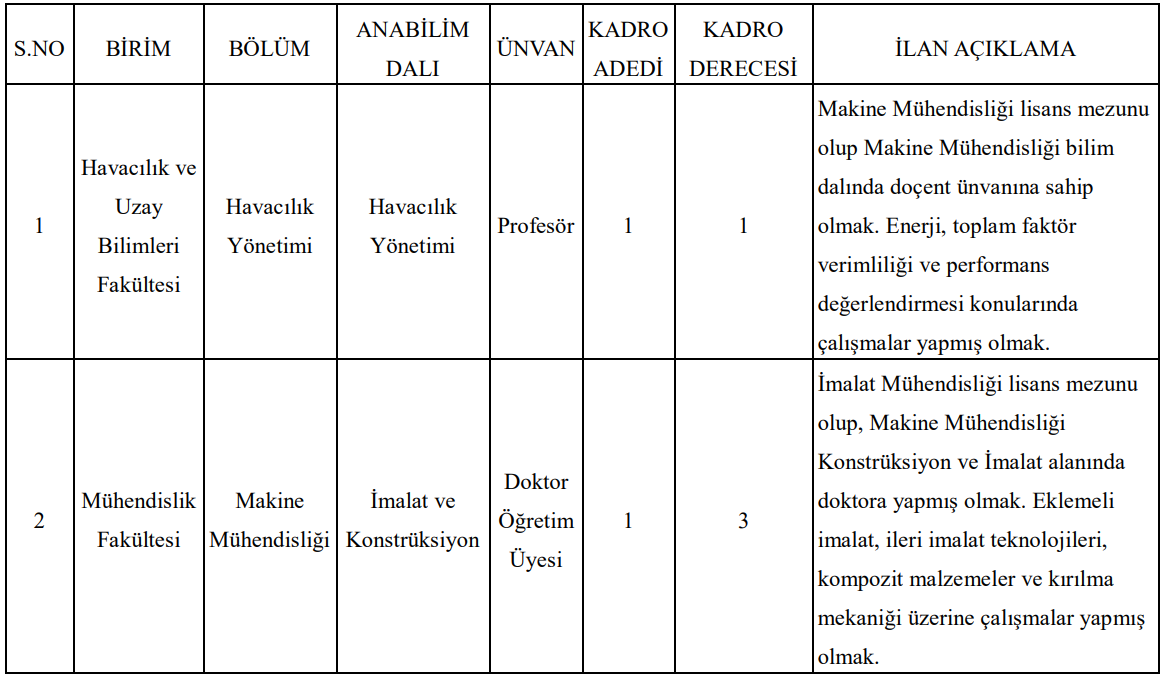 Havacılık ve Uzay Bilimleri Fakültesi için profesör kadrosunda, makine mühendisliği kökenli ve enerji ile verimlilik alanında çalışmaları bulunan adaylar aranıyor. Mühendislik Fakültesi için açılan doktor öğretim üyesi kadrosunda ise imalat teknolojileri, kompozit malzemeler ve kırılma mekaniği alanlarında uzmanlaşmış adaylara öncelik veriliyor.