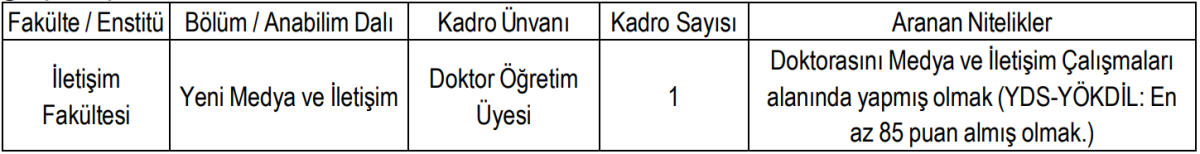 Üniversitenin öğretim üyesi ilanında ise iletişim alanında doktora yapmış adaylar için kadro açıldığı belirtildi. Başvurular şahsen yapılacak ve adayların gerekli belgeleri fiziki olarak teslim etmeleri gerekecek.