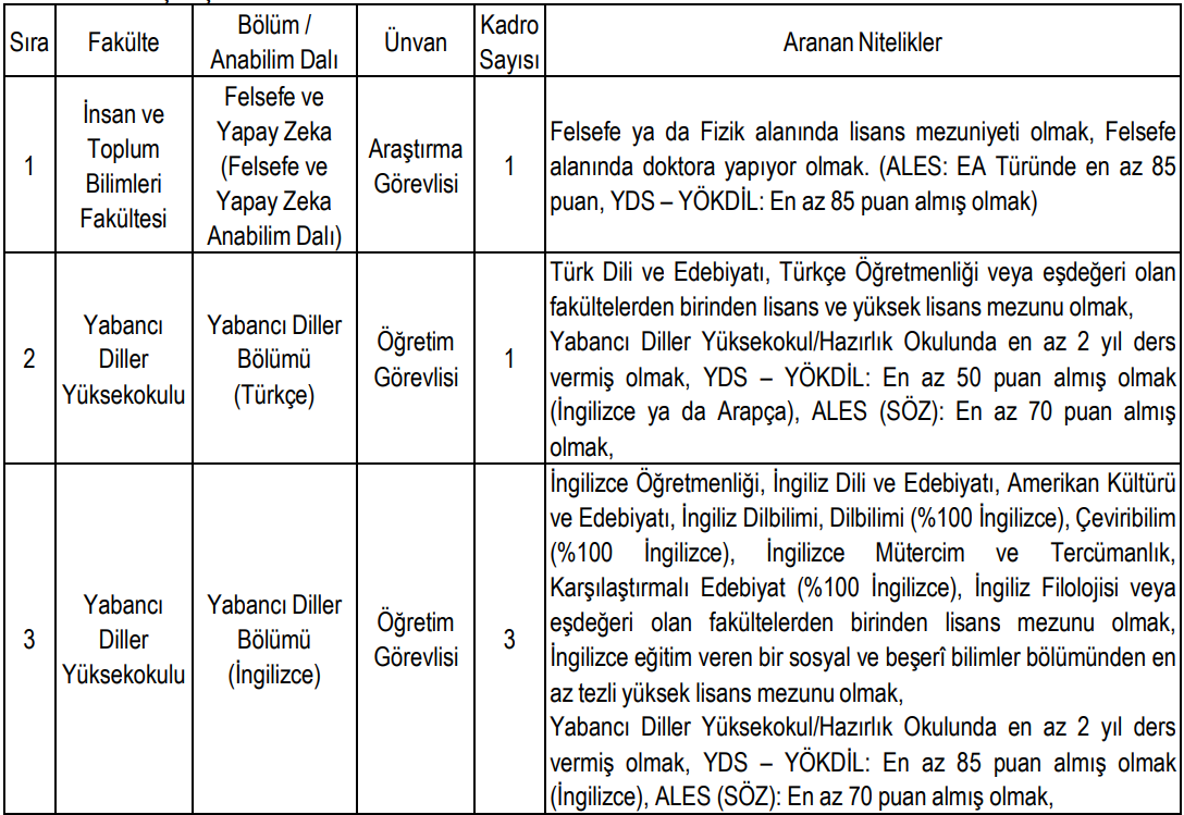 Araştırma görevlisi kadrosu için yüksek ALES ve yabancı dil puanı şartı dikkat çekerken, öğretim görevlisi kadrolarında en az iki yıl deneyim aranıyor. Ayrıca İngilizce alanında öğretim görevlisi kadroları için yüksek dil puanı şartı öne çıkıyor.