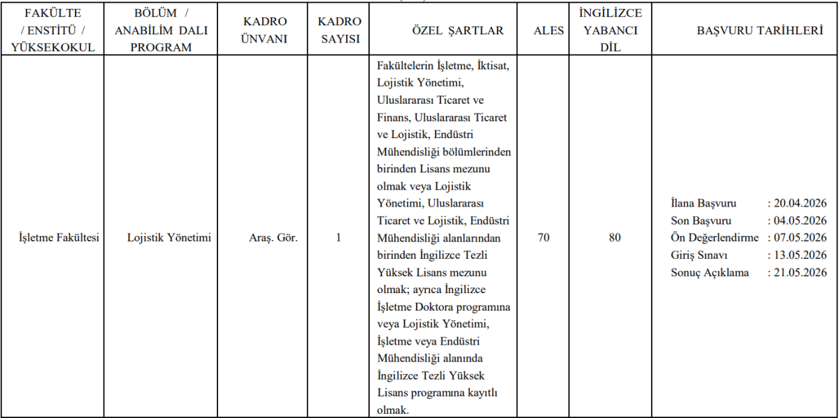 İlan kapsamında ALES’ten en az 70 ve yabancı dil sınavından en az 80 puan şartı aranıyor. Başvuru süreci sonrasında adaylar ön değerlendirme ve giriş sınavına tabi tutulacak.