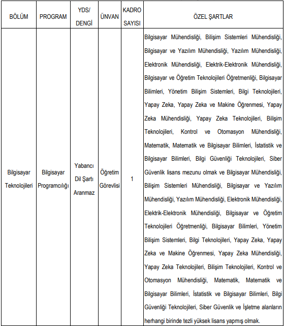 Ataşehir Adıgüzel Meslek Yüksekokulu, bilgisayar programcılığı alanında öğretim görevlisi alımı yapacağını duyurdu. Bu kadro için geniş bir mühendislik ve bilişim mezuniyeti yelpazesi kabul ediliyor.
