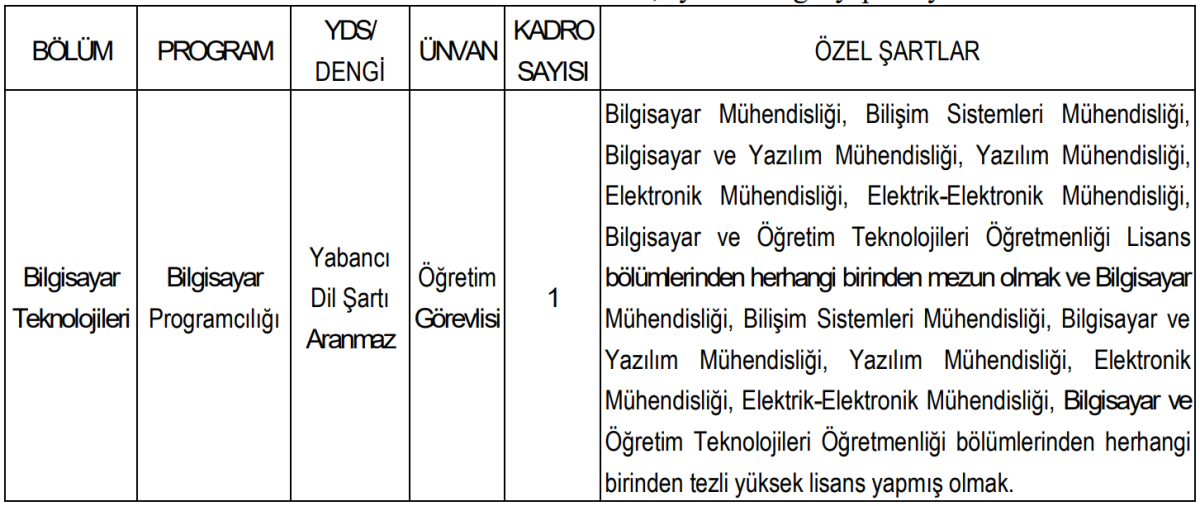 İlan kapsamında Bilgisayar Programcılığı Programı için 1 öğretim görevlisi alınacak. Bu kadro için yabancı dil şartı aranmayacak.