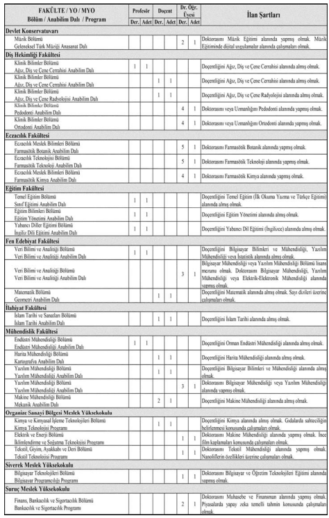 İlan açıklamasına göre profesör ve doçent adaylarının dilekçelerini Rektörlüğe, doktor öğretim üyesi adaylarının ise ilgili birime hitaben yazmaları gerekiyor. Dilekçede başvurulan birim, anabilim dalı ve ilanın açıklama bölümünde belirtilen çalışma alanı yeterliklerinin sağlandığı açıkça belirtilmeli ve bu yeterlikler belgeyle sunulmalı.