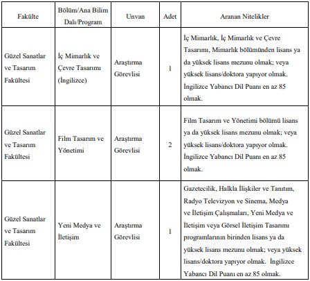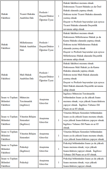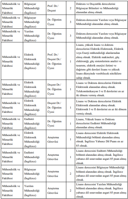 İlanda yer alan kadrolar arasında özellikle mühendislik ve sosyal bilimler fakülteleri öne çıkıyor. Bilgisayar Mühendisliği, Yazılım Mühendisliği, Elektrik-Elektronik Mühendisliği, Endüstri Mühendisliği gibi bölümlerde çok sayıda araştırma görevlisi ve öğretim üyesi alımı yapılacak.