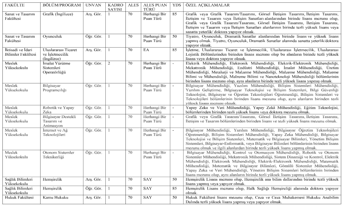 Üniversite tarafından yayımlanan ikinci ilanda ise öğretim görevlisi ve araştırma görevlisi kadrolarına yapılacak alımların koşulları paylaşıldı. Öğretim görevlisi kadrolarına başvuracak adayların ALES’ten en az 70 puan almış olması ve tezli yüksek lisans derecesine sahip bulunması gerekiyor. Yabancı Diller Birimi için başvuran adaylardan ise YDS veya eşdeğer bir sınavdan en az 85 puan şartı aranıyor.