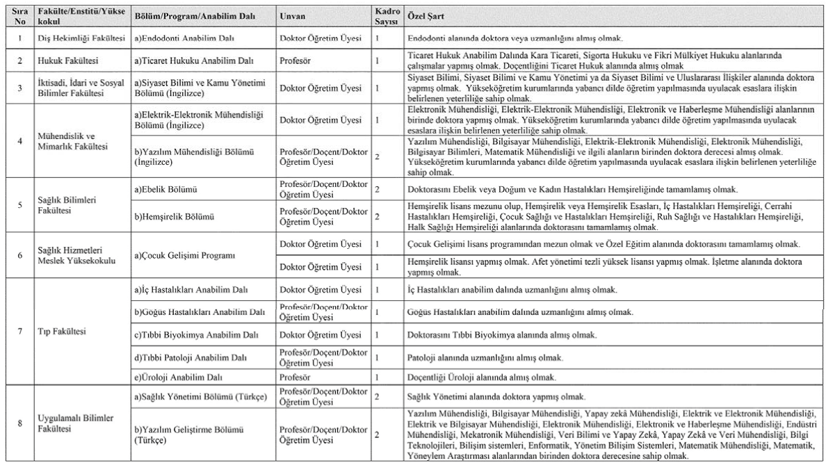 Öğretim üyesi kadroları için başvurular, ilanın Resmî Gazete’de yayımlandığı tarihten itibaren 15 gün içerisinde yapılabilecek. Başvuru süresinin sona ermesinin ardından yapılan ya da eksik evrak içeren başvurular değerlendirmeye alınmayacak.