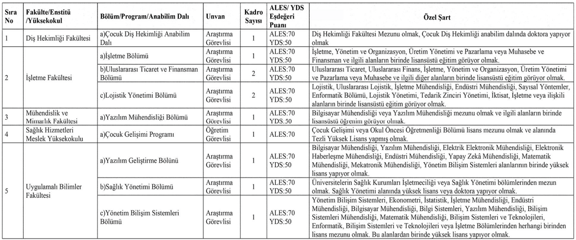 Araştırma görevlisi ve öğretim görevlisi kadrolarına başvuracak adaylardan; başvuru dilekçesi, YÖK formatında özgeçmiş, ALES belgesi, diploma ve transkriptler, yabancı dil sonuç belgesi, askerlik durum belgesi ve ikametgah belgesi talep ediliyor.