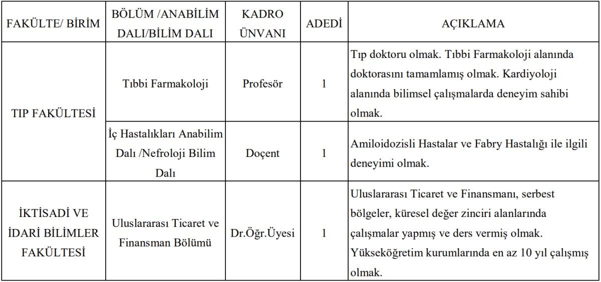 Tıp Fakültesi Tıbbi Farmakoloji Anabilim Dalı’na 1 Profesör alınacak. İç Hastalıkları Anabilim Dalı Nefroloji Bilim Dalı’na ise 1 Doçent kadrosu açıldı. İktisadi ve İdari Bilimler Fakültesi Uluslararası Ticaret ve Finansman Bölümü için 1 Dr. Öğretim Üyesi istihdam edilecek.