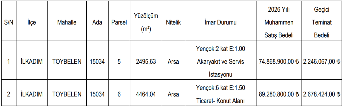 İhale kapsamında satışa çıkarılan taşınmazlardan ilki, İlkadım ilçesi Toybelen Mahallesi’nde yer alan 15034 ada 5 parsel numaralı arsa oldu. Yaklaşık 2 bin 495 metrekare büyüklüğündeki taşınmazın imar planında “Akaryakıt ve Servis İstasyonu” alanı olarak yer aldığı, Yençok 2 kat ve emsal değerinin 1.00 olduğu açıklandı. Bu arsa için belirlenen muhammen satış bedeli 74 milyon 868 bin 900 TL, geçici teminat bedeli ise 2 milyon 246 bin 67 TL olarak duyuruldu.