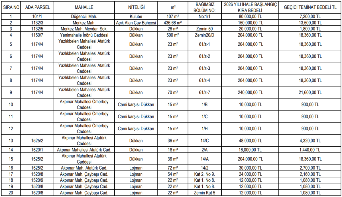 bulunuyor. Kiralama bedelleri yıllık 10 bin TL’den başlayıp 240 bin TL’ye kadar çıkabiliyor. Taşınmazlar; Merkez Mahallesi, Akpınar Mahallesi, Yazlıkbelen, Yenimahalle ve Düğencili Mahallesi gibi ilçenin farklı noktalarında yer alıyor.