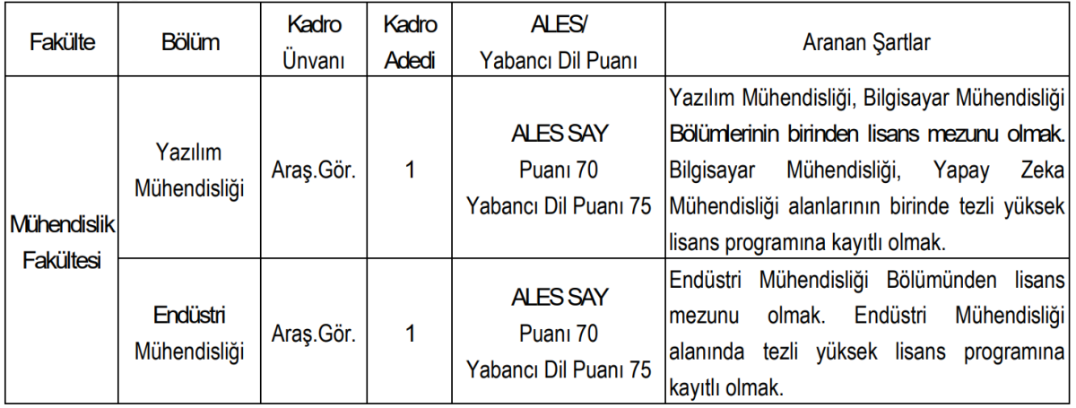 Mühendislik Fakültesi için ek olarak İngilizce yabancı dil puanının en az 75 olması şartı bulunuyor. Erkek adayların askerlik durumlarını gösteren onaylı belgenin sunulması, adli sicil ve arşiv kaydı belgesinin “Resmi Kuruma Hitaben” alınmış olması da zorunlu tutuluyor.