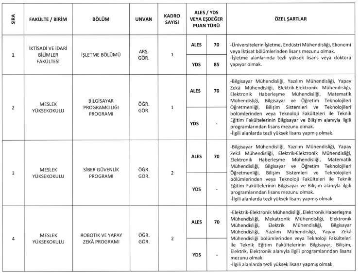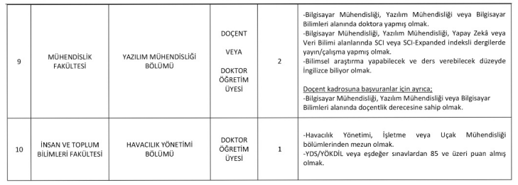 Bu kadrolar için adaylardan SCI veya SCI-Expanded indeksli dergilerde yayın yapmış olmaları ve ileri düzey İngilizce yeterliliğine sahip olmaları bekleniyor.