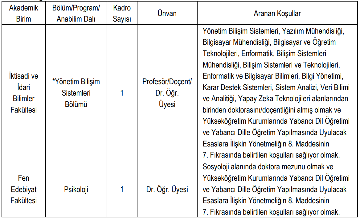 Bu kadroya başvuracak adayların; Yönetim Bilişim Sistemleri, Yazılım Mühendisliği, Bilgisayar Mühendisliği, Bilişim Sistemleri Mühendisliği, Veri Bilimi ve Analitiği, Yapay Zeka Teknolojileri, Karar Destek Sistemleri veya Sistem Analizi gibi alanlardan birinde doktora veya doçentlik unvanına sahip olmaları gerekiyor. Ayrıca adayların, Yükseköğretim Kurumlarında Yabancı Dil Öğretimi ve Yabancı Dille Öğretim Yapılmasına İlişkin Yönetmelik hükümlerini karşılaması şartı aranıyor.