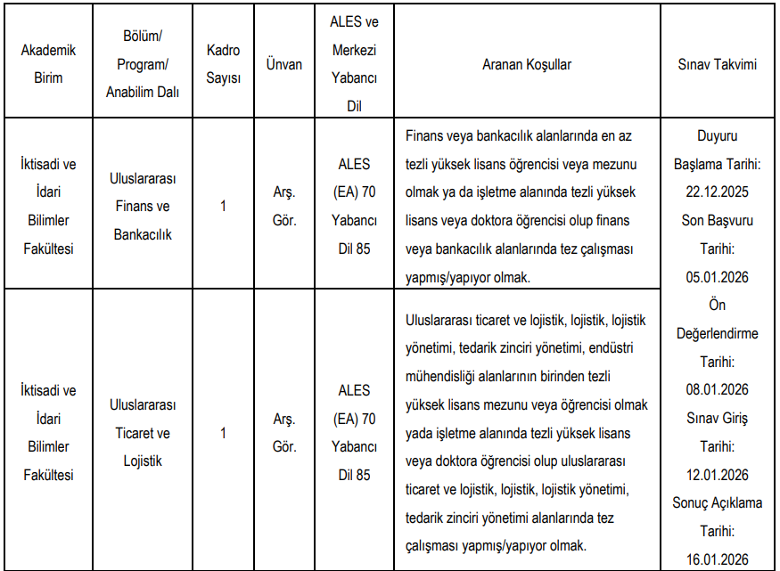 Çağ Üniversitesi ayrıca, öğretim üyesi dışındaki öğretim elemanı kadroları için de ilan yayımladı. Bu kapsamda İktisadi ve İdari Bilimler Fakültesi bünyesinde iki ayrı araştırma görevlisi kadrosu bulunuyor.