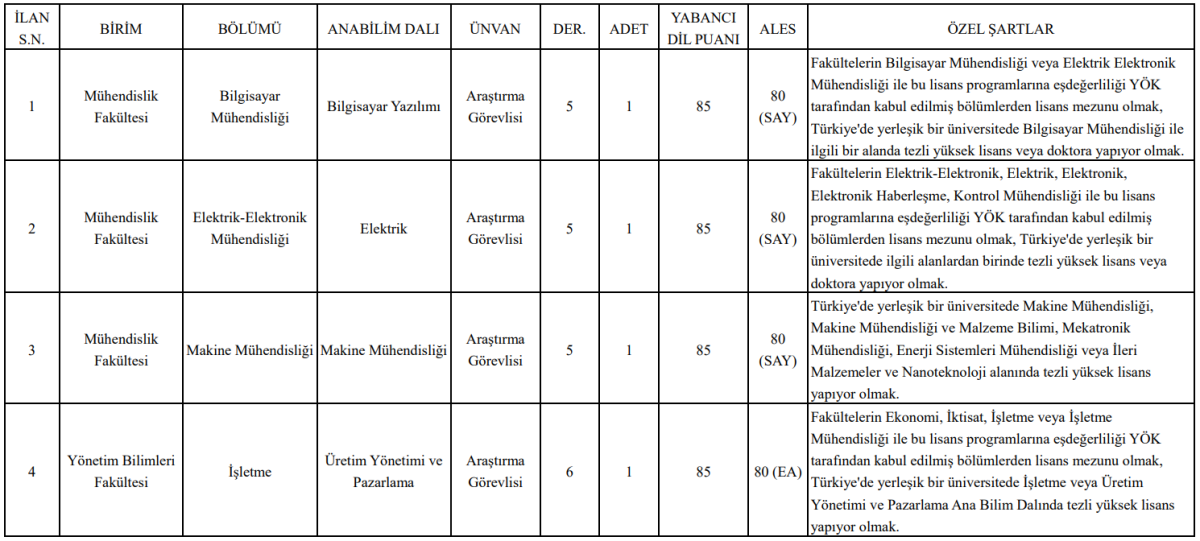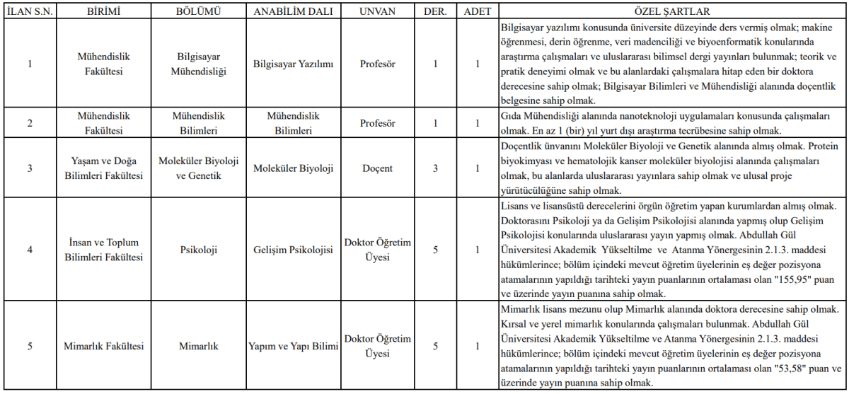 Bilgisayar yazılımı alanında üniversite düzeyinde ders verme deneyimine sahip, makine öğrenmesi, derin öğrenme, veri madenciliği ve biyoenformatik alanlarında uluslararası yayınları bulunan adaylar başvurabilecek. Ayrıca adayların, Bilgisayar Bilimleri ve Mühendisliği alanında doçentlik belgesine sahip olması gerekiyor.