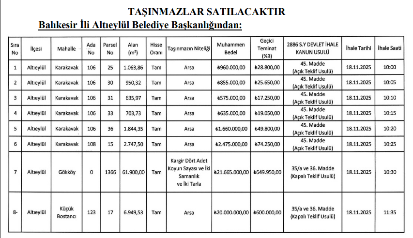 İhaleler, 18 Kasım 2025 Salı günü Altıeylül Belediyesi Gazi Mustafa Kemal Atatürk Yaşam Kompleksi (4.kat) Belediye Meclis Salonu'nda, tabloda belirtilen saatlerde art arda gerçekleştirilecek.