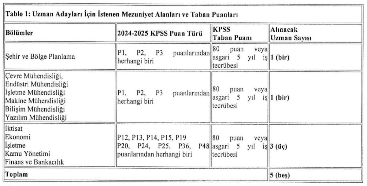 Uzman personel adayları için özel şartlar da bulunuyor. KPSS puanı ile başvuran adayların, lisans eğitimlerini belirtilen alanlardan tamamlamış olmaları ve ÖSYM tarafından yapılan 2024 veya 2025 KPSS sınavlarından en az 80 puan almış olmaları gerekiyor. Ayrıca, son 5 yıl içinde İngilizce dil bilgisi yeterliliğini gösteren C düzeyi veya eşdeğer bir belgeye sahip olmaları şart.