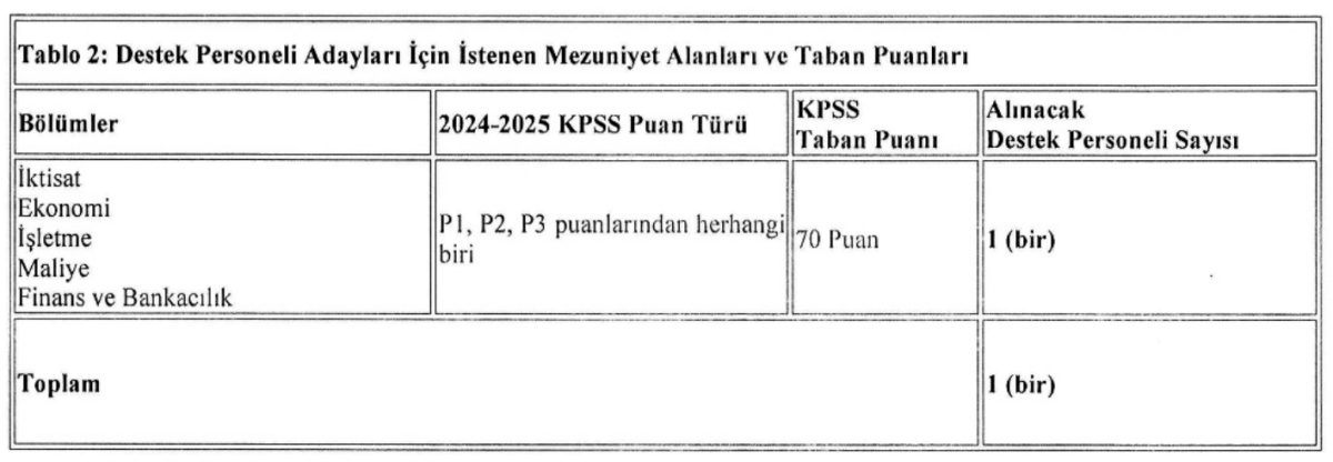Destek personeli (büro görevlisi) pozisyonu için adayların 2024 veya 2025 KPSS sınavlarından en az 70 puan almış olması ve ilgili bölümlerden lisans mezunu olmaları isteniyor.