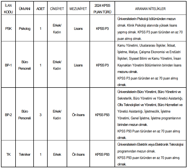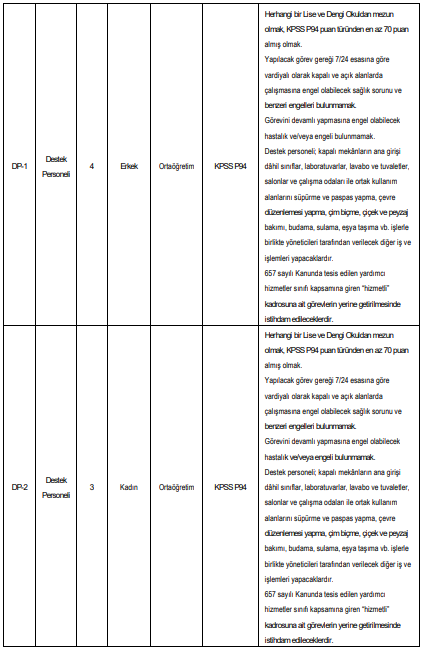 Destek Personeli (Kadın, 3 kişi) – Lise mezunu, KPSS P94 puanı en az 70, görevini sürekli yapmaya engel rahatsızlığı bulunmamak.