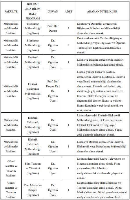 Dr. Öğretim Üyesi kadrosu için 2 kişi. Adaylardan biri yapay zekâ alanında çalışmaları olan, diğeri ise Elektrik, Elektronik veya Haberleşme Mühendisliği alanında doktora sahibi olacak.