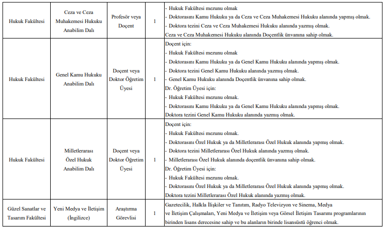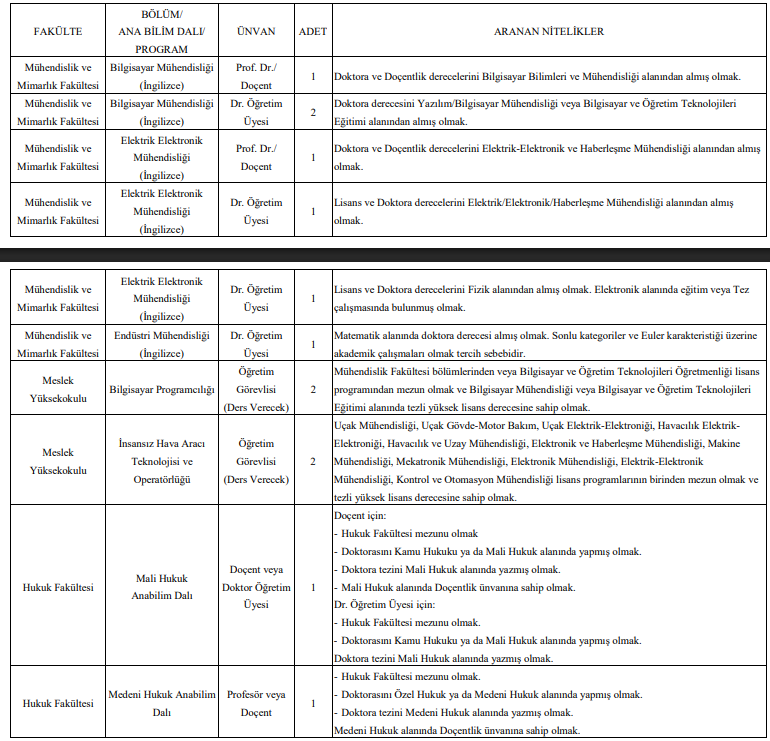 Üniversite tarafından açılan kadrolar arasında profesör, doçent, doktor öğretim üyesi, öğretim görevlisi ve araştırma görevlisi unvanları yer alıyor.