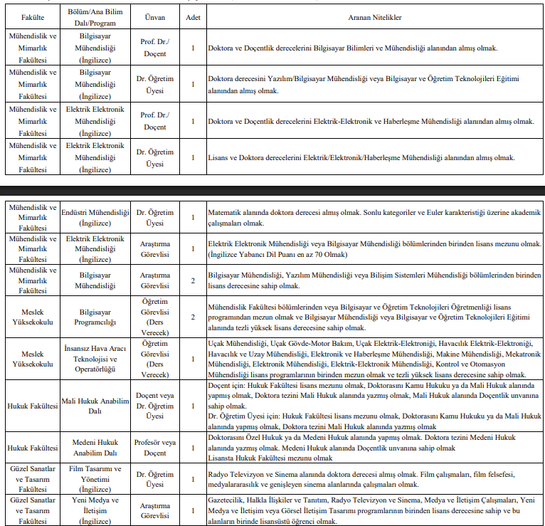 Alım yapılacak fakülte, bölüm ve unvanlar şu şekilde: